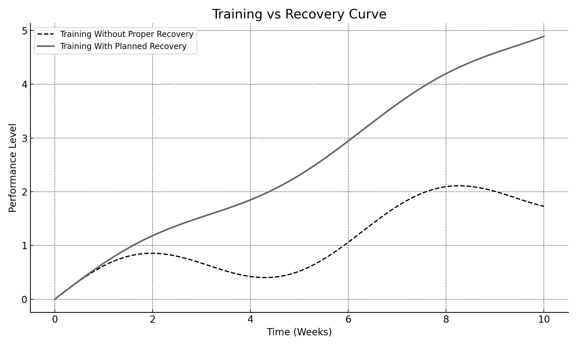 This graph highlights the âsupercompensationâ model: recovery allows your body to adapt beyond its previous state. Skip that recovery, and youâre stuck playing catch-up or worse, digging into fatigue.